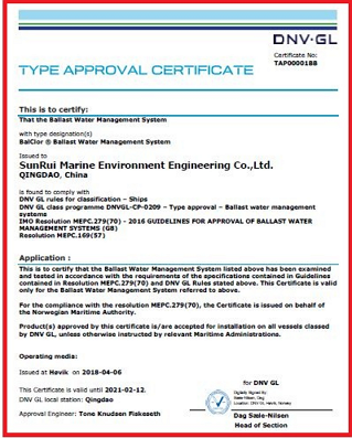 On April 6, 2018,  SunRui Marine Environment Engineering Company Ltd (hereinafter referred to as SunRui) ‘s BalClor®   ballast water management system (BWMS), was issued the new IMO G8 & G9 certification by DNV GL, acting on behalf of the Norwegian Maritime Authority (NMA). This is another significant milestone for SunRui Company after it was the fourth globally and the first in Asia to be awarded United States Coast Guard (USCG) type approval certification. SunRui’s IMO revised G8 & G9 certified BalClor® BWMS uses world’s leading high-performance filtration + indirect electrolysis technology, having treatment capacity of 170 �C 8500 m3/h.