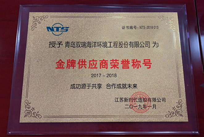 此次评奖,江苏新时代造船厂从品牌影响力、价格合理性、产品质量、技术支持、售后服务等五个维度对全部50余家供应商进行综合评价,最终评选出18家船配企业成为“金牌供应商”。青岛双瑞公司作为船厂压载水供应商获此殊荣。