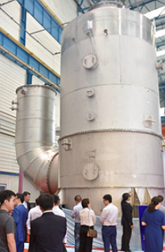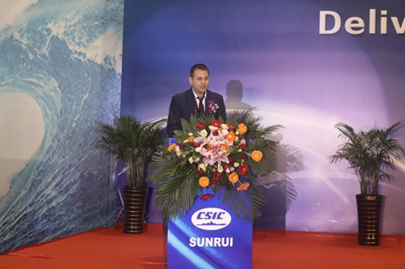 仪式上,青岛双瑞总经理付洪田先生发表热情洋溢的致辞,对出席活动的各位领导和嘉宾表示欢迎和感谢。希腊船东代表Spyridon先生赞扬了青岛双瑞公司的产品质量,认为该产品从各个方面均达到国际一流水准。大连船舶重工集团总经理杨志忠先生讲话,强调了青岛双瑞和大船装备强强联手、通力合作的重要而深远的意义。在现场热烈的掌声中,Spyridon先生、杨志忠先生、付洪田先生共同按下仪式启动球,覆盖脱硫洗涤塔的大幕缓缓落下,将活动气氛推向了高潮。之后,参会嘉宾参观了洗涤塔产品,对产品的设计水平和制造水准给予了高度肯定。