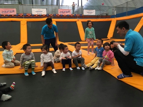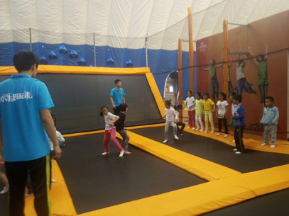 欢快的开场舞调动了每位孩子的情绪,使他们从陌生到相识,快速进入了玩乐状态。年幼组的小宝宝们,在蹦床上跑跑跳跳,无拘无束尽情释放他们的纯真,活脱脱一群可爱小精灵;年长组的小朋友们,则变身成孙悟空,在教练的带领下“大闹蟠桃会”、“三打白骨精”、“过海取经”,不断的挑战自己,攀登高峰。