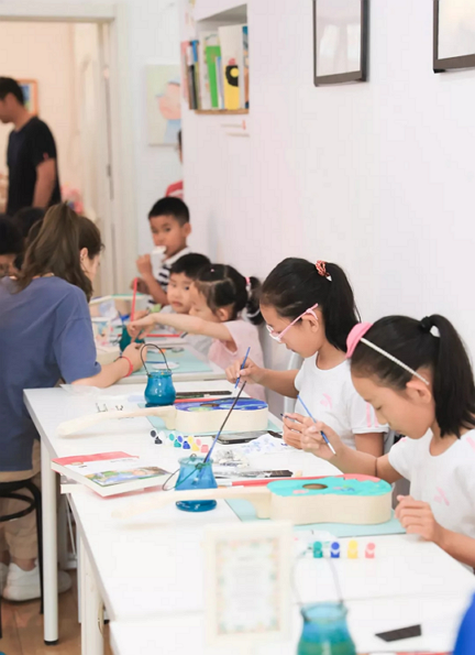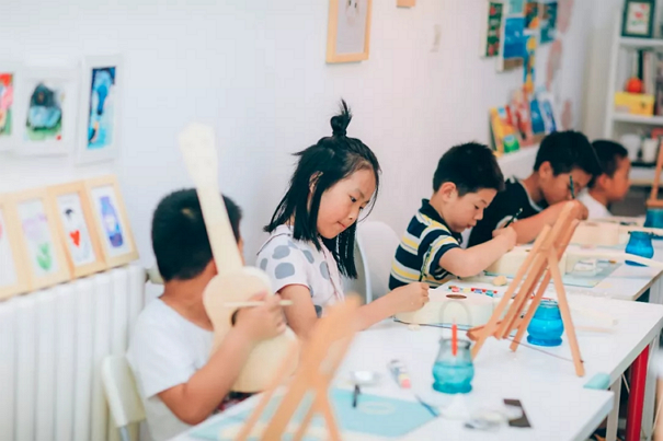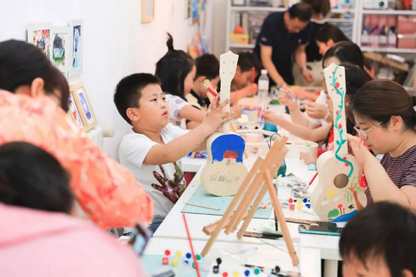 在老师的专业指导下,小朋友们发挥自己的想象力和创造力,从构思图样、绘制稿图到调色、上色再到组装琴头、琴枕、指板。