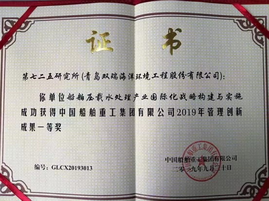 近日,青岛双瑞公司接到中国船舶重工集团有限公司通知,公司申报的管理创新成果《船舶压载水处理产业国际化战略构建与实施》,荣获集团公司管理创新成果一等奖。青岛双瑞公司首次获此殊荣。