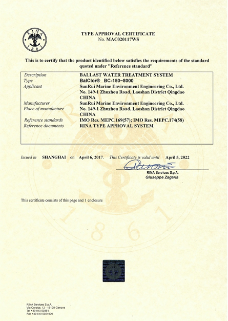 近日,青岛双瑞BalClor®压载水管理系统系列产品成功取得了意大利船级社(RINA)型式认可证书,目前公司BalClor®压载水管理系统已获得9家国际权威船级社/国家主管机关的型式认可证书,成为全球获得权威认证证书最多的压载水管理系统供应商之一。