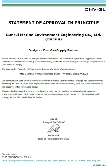 继6月获得LR船级社原理认可(AIP)证书后,青岛双瑞公司自主研发设计的船用LNG供气系统(FGSS)再获DNV GL船级社AIP证书,标志着该产品在系统原理和安全可靠性设计方面完全满足IGF规则和DNV GL规范要求。